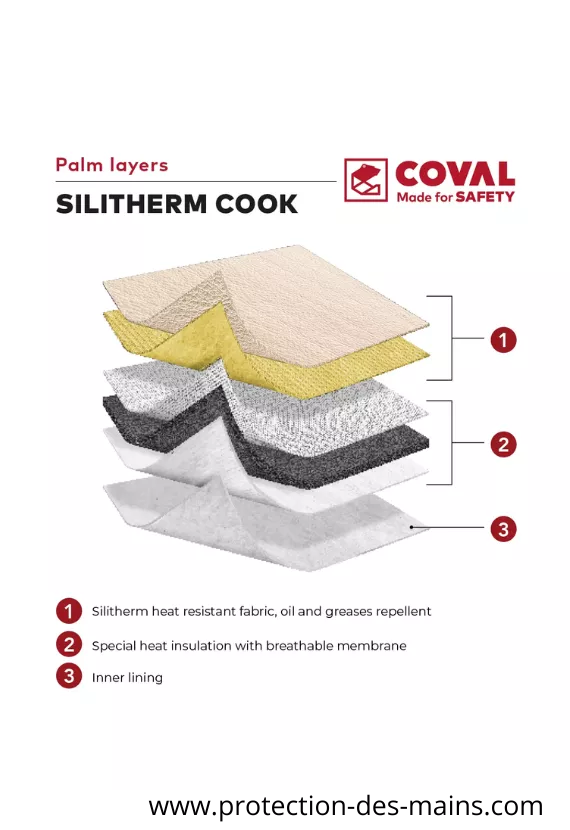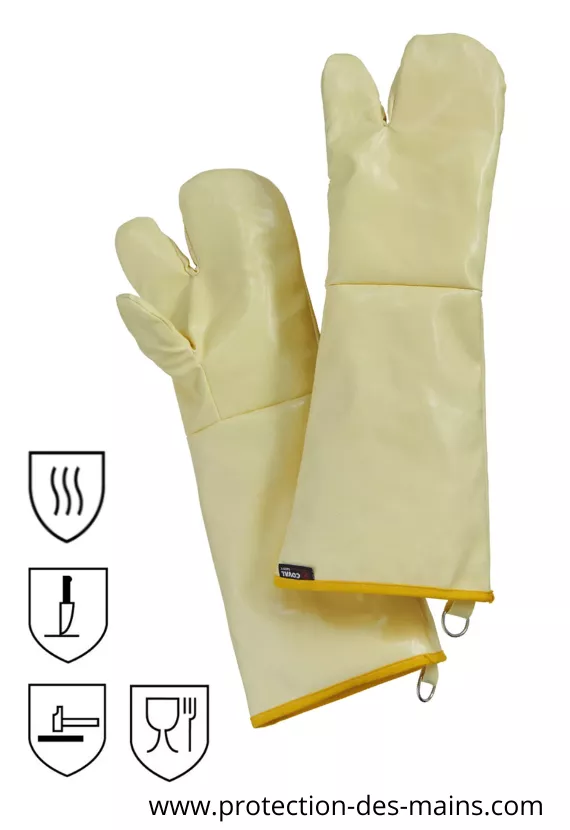 Pensé pour les professionnels de la restauration, le gant 3 doigts Silitherm Cook 350°C certifiés alimentaire assure une excellente protection thermique jusqu’à 350°C. Ce modèle à 3 doigts offre une prise en main facilitée et une meilleure performance thermique que le modèle 5 doigts . Conçu en multicouches para-aramide avec paume et doigts enduits de silicone alimentaire, il résiste aux liquides, à la vapeur et aux graisses. Sa longue manchette protège l’avant-bras et son crochet intégré permet un séchage facile après rinçage. Idéal pour les environnements humides et gras.