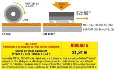 Ces gants entièrement tissés dans une fibre aramidique Kevlar DuPont™ renforcés de fils métalliques et recouverts d'une enduction en latex granité anti dérapant sont d'un haut niveau de protection. Classés E à la nouvelle norme TDM (résistance au cisaillement - EN ISO 13997 - A étant le mini F le maxi) ils sont également extrêmement performants à l'abrasion, à la déchirure et à la perforation selon la norme EN 388. Une classification 2 à la chaleur de contact vous permet de manipuler durant 15 secondes des pièces à 250°.